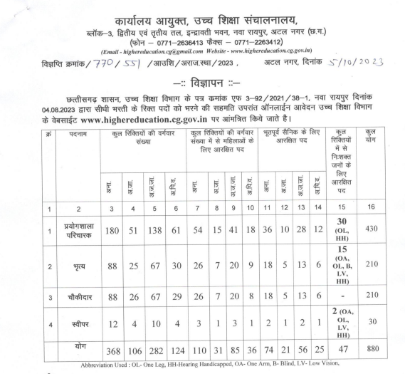 CG Higher Education Department Vacancy 2023 छ.ग. उच्च शिक्षा विभाग में प्रयोगशाला परिचारक, भृत्य, चौकीदार और स्वीपर के 880 पदों पर बम्पर भर्ती, अभी अप्लाई करें अगर आप लंबे समय से सरकारी नौकरी की तलाश कर रहे हैं, तो आपको बता दें, CG Higher Education Department Vacancy 2023 में कई पद पर सरकारी नौकरी निकली है। छत्तीसगढ़ शासन, उच्च शिक्षा विभाग में प्रयोगशाला परिचारक, भृत्य, चौकीदार और स्वीपर के 880 पदों पर सीधी भर्ती के लिए ऑनलाइन आवेदन फॉर्म सीजी उच्च शिक्षा विभाग के वेबसाइट http://highereducation.cg.gov.in/ पर आमंत्रित किया जाता है। इक्छुक उम्मीदवार जो शैक्षणिक योग्यता पूर्ण करते हो अंतिम तिथि तक आवेदन कर सकते हैं।